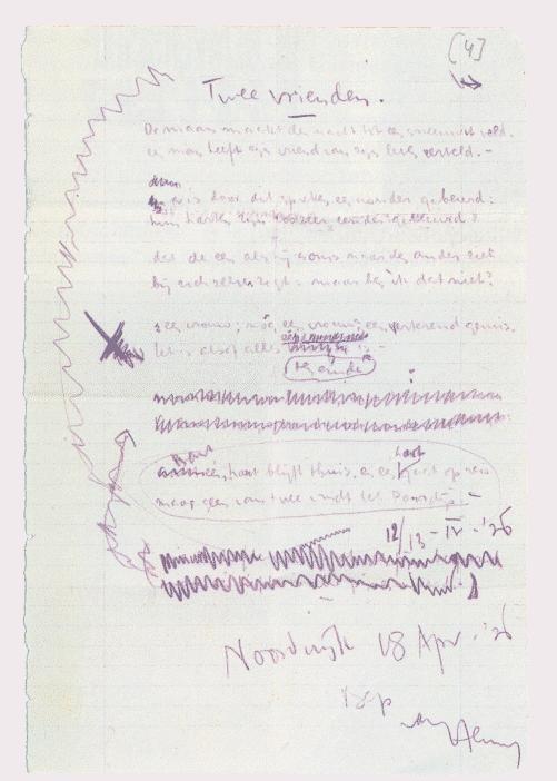 Twee vrienden // De maan maakt den nacht tot een sneeuwwit veld. / een man heeft zijn vriend van zijn leven verteld. – // er is door dit spreken een wonder gebeurd: / hun harten zijn zoozeer eender gekleurd // dat de een als hij soms naar den ander ziet / bij zichzelven zegt: maar ben ík dat niet? // een vrouw; nog een vrouw; een verterend gemis, / het is alsof alles teneinde is – // Want eén hart blijft thuis, en eén hart gaat op reis / maar geen van twee vindt het Paradijs. // 12 / 13-IV-’26 // Noordwijk 18 Apr. ’26 // Bep / van Henny