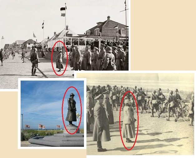 Wilhelmina was Noordwijk toen allang ontvlucht. Teruggekomen is ze – ook na de oorlog – volgens mij niet meer anders dan in verstilde vorm: op de boulevard staat tegenwoordig een standbeeld van deze majesteit, in brons gemodelleerd naar bijgaande foto. In mei 2000 aangeboden door Hotel Oranje, onthuld door Erik Hazelhoff Roelfzema, de Ware Soldaat van Oranje (in april 1940 niet bij de paraderende troepen in Noordwijk aanwezig, maar nog ‘ingekwartierd’ in een studentenkot aan het Rapenburg in Leiden).
