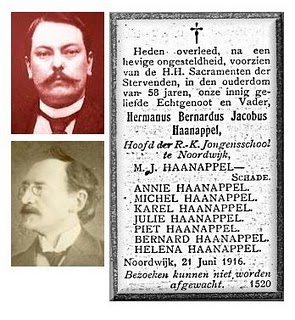 In zijn Noordwijkse periode woonde Moerel in bij de hoofdonderwijzer van de RK Jongensschool, Hermanus Bernardus Jacobus Haanappel. Meester Haanappel (grote foto) werd geboren op 25 juli 1857 in Doesburg. Hij stierf in het harnas in Noordwijk – na een hevige ongesteldheid – op 21 juni 1916, 58 jaar oud. Haanappel was eerder hulponderwijzer en onderwijzer geweest in Eindhoven, Doesburg en Purmerend. In die laatstgenoemde plaats trouwde hij op 23 januari 1890 met Maria Schade die op 2 april 1867 was geboren in Purmerend. Zij overleed op 14 september 1942 in Overveen, maar werd twee dagen later al begraven in Noordwijk.