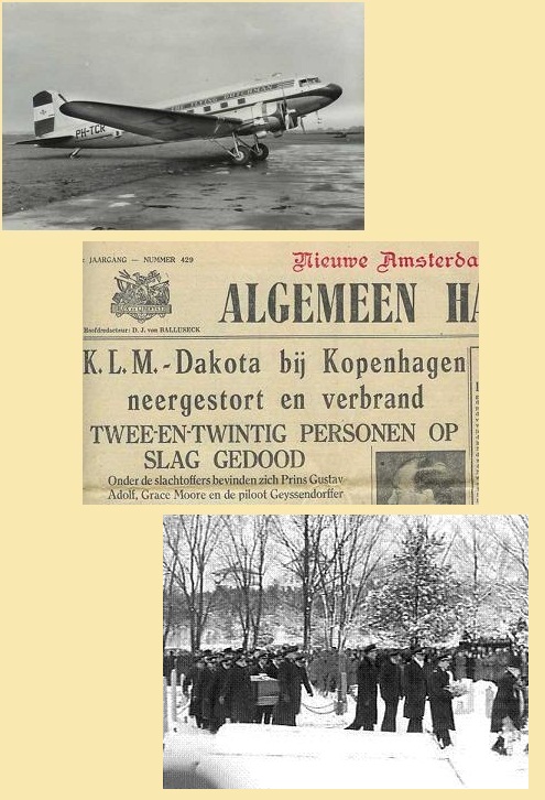 Het KLM lijntoestel van Schiphol naar Stockholm maakt, na een normaal verlopen vlucht, om 14.58 uur een tussenlanding in Copenhagen. Van de 7 passagiers stappen er drie uit. De overigen, waaronder prins Gustav Adolf van Zweden en zijn secretaris Stendock, blijven aan boord. Twaalf nieuwe passagiers stappen in. Hierbij is de bekende Amerikaanse zangeres Grace Moore.