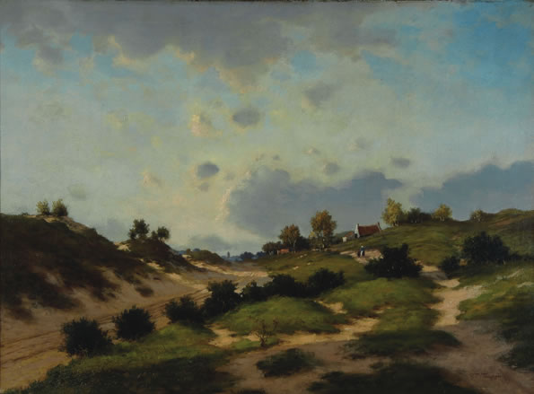 Ik vind het wel een mooi schilderij: (waarschijnlijk) de watertoren van Noordwijk in het verste perspectief centraal in het beeld, de schaduwen die prachtig over het duinzand glijden. De onbestemde lucht die verraadt dat er zwaar weer komt opzetten uit zee, de karresporen, de net wit gepleisterde duinboerderij. Het beeld lijkt me ergens van vanaf de Duindamse Slag, misschien vóór de afgraving en de herverkaveling en dan wat dichter landinwaarts. Weinig te bespeuren van de dennenbomen, die daar vroeger (en nu nog een heel klein beetje) zo beeldbepalend waren.
