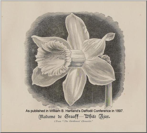 Als we het hebben over "Noordwijks Glorie" dan hebben we het niet alleen over dahlia’s, maar ook over andere bloemen (en trouwens niet alleen over bloemen). We spreken ook over een volledig gestamboekte narcis met die naam. Deze Glorie was in 1902 gekweekt door de firma J.de Groot en Zonen. Een Noordwijks bedrijf, naar alle waarschijnlijkheid, want een kweker uit Noordwijkerhout of uit Sassenheim zal zijn boreling niet ‘Noordwijks" Glorie noemen. J. de Groot en Zonen brachten de genen samen van 2 andere narcissen, Madame de Graaff en Victoria (vraag me niet naar de biologische verantwoording van de kruising van twee vrouwennamen, maar het gaat uiteindelijk om het samenbrengen van het zaad van de één met de stek van een ander). Madame de Graaff was pas 15 jaar toen zij haar boreling kreeg (‘seed parent’ heette ze), want zij zelve was in 1887 door De Graaff Bros (aan de Schiestraat) gekweekt (en prompt naar de Vrouw des Huizes vernoemd). De knol waarop Noordwijks Glorie mocht opgroeien (‘pollen parent’) was ene Victoria, in 1897 door ene M.Vos gekweekt.