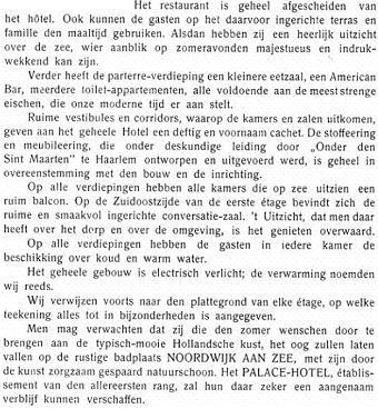Plukken doe ik maar hier en daar maar wat uit de brochure, integraal afdrukken is te veel van het goede. En de brochure bevat alleen maar ‘het goede’. Over de inrichting van het hotel bijvoorbeeld. Er was een American Bar, wat toen (en in sommige etablissementen nog steeds) als heel chique werd beschouwd. ” Toilet-appartementen, alle voldoende aan de meest strenge eischen, die onze moderne tijd er aan stelt.” Op de stoffeering en meubileering werd ook niet afgedongen, want geheel en al verzorgd door de toen grootste en meest creatieve meubelfabriek van Nederland ‘Onder den Sint Maarten’ te Haarlem (1901-1941). Er was warm en koud water in alle appartementen, het gehele gebouw was electrisch verlicht en centraal verwarmd. Luxe laat zich niet bemeten. Het Palace Hotel was voorwaar “een etablissement van den allereersten rang”.
