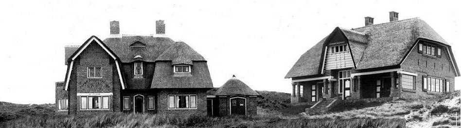 Op de foto lijkt het alsof ze naast elkaar zijn gebouwd, maar in werkelijkheid lag er nogal wat meters duingrond tussen. “Zomerhuis Zonnewende” (rechts) aan de Koepelweg, “Landhuis De Zeevonk” (links) aan de Beethovenweg. Dat beide huizen hier niettemin naast elkaar staan afgebeeld, ieder met hun eigen karakter en architectuur (het ‘wolfdak’ van Zonnewende tegenover het ‘zadeldak’ van de Zeevonk) heeft alleen te maken met het feit dat beide huizen van dezelfde schepper zijn: architect Theo Rueter (1876-1963).