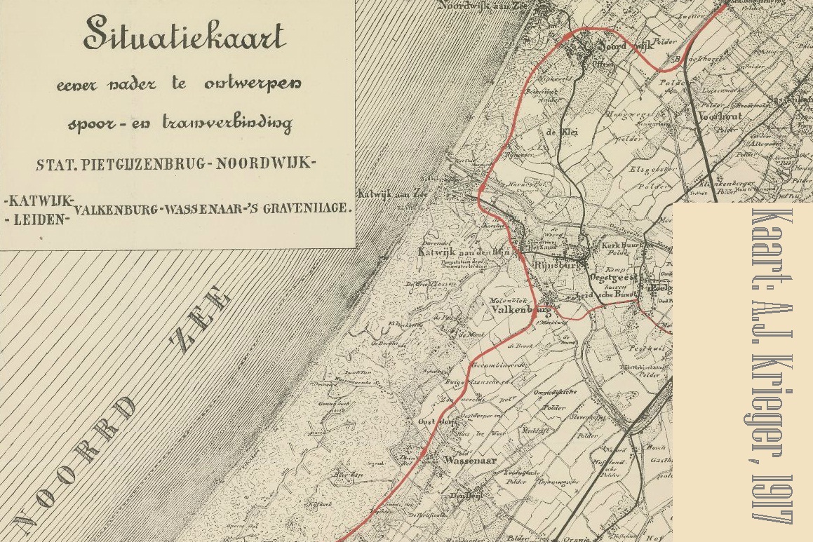 In 1917 werd bijgaande kaart vervaardigd door ene A.J. Krieger, die blijkbaar in opdracht (maar van wie?) een kaart tekende van de regio Leiden met daarin geprojecteerd een spoorlijn van Den Haag/Scheve-ningen via Wassenaar, Katwijk en Noordwijk naar Noordwijkerhout (waar bij Piet Gijzenbrug de aansluiting op de oude spoorlijn werd gemaakt). Blijkbaar waren er toen al plannen om de regio Katwijk/Noordwijk ook via het treinspoor te ontsluiten.