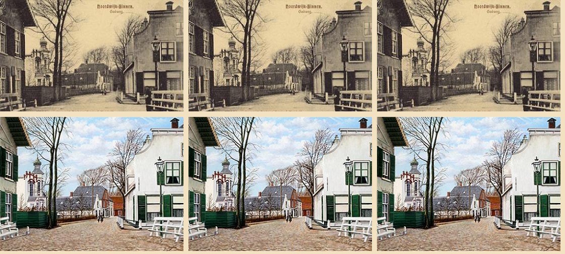 Rob van Assen kleurt geen foto’s in: hij maakt compleet nieuwe ‘foto’s’ met olieverf en een uiterst fijn penseel. Het resultaat is vaak verbluffend. Zoals deze oude foto van J.Braakman, bij hem om de hoek genomen, van de ‘Villa Mignon’ aan het einde van de Voorstraat in Noordwijk-Binnen. Een kleurenfoto van het verleden. Een echte.