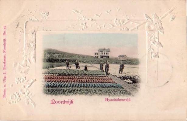De afbeelding is weer bijzonder, want wat mij betreft bijna een zoekplaatje. De oude Braakman heeft er weer eens niet met zijn kleurpotloden af kunnen blijven, van zijn eigen foto, maar dat zij hem vergeven. Wat hem niet vergeven kan worden is dat hij in dit geval wat preciezer had moeten zijn met de aanduiding. Dat van die hyacinthen geloof ik wel, maar die villa.