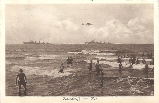 Ik houd het maar op een oefening van de Nederlandse armee, waarvan badgastend Noordwijk toevallig getuige mocht zijn. Het vliegtuig lijkt een Dornier DO-24, destijds speciaal voor de Nederlandse marine ontwikkeld. Maar dat ding ging pas de lucht in 1930 en dat strookt dan weer niet met de datering van de foto. Soit.