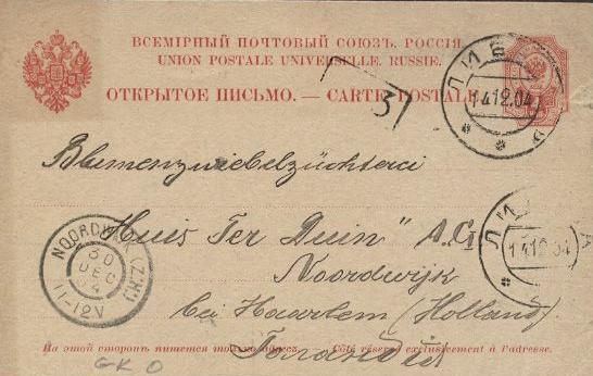 Mijn Russisch is niet van dien aard dat ik aan de hand van het poststempel kan achterhalen waar deze kaart überhaupt vandaan kwam. Wel is duidelijk waar die héén ging: naar de Blumenzwiebelzüchterei van Wilhelm Tappenbeck in Noordwijk aan Zee (bij Haarlem zette de Rus er voor de zekerheid bij).