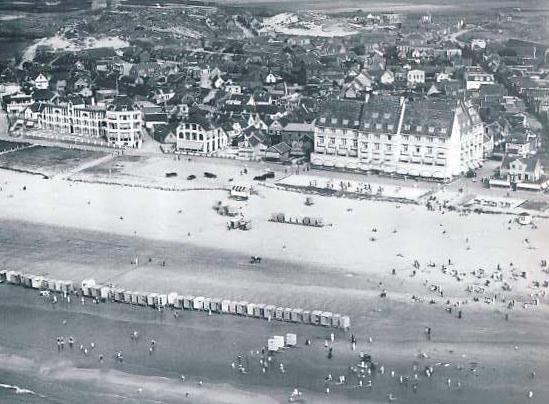 Deze foto markeert de overgang van een ouderwetse naar een moderne badplaats: op het strand staan nog in gelid opgesteld de badkoetsjes, die al vanaf het midden van de 19e eeuw dienst deden op het Noordwijkse strand. En zo te zien hebben ze zichzelf op deze foto al overleefd, want iedereen gaat erom heen, rechtstreeks de zee in. Op de boulevard prijkt inmiddels het majestueuze en mondaine Palace Hotel, (gebouwd in 1912), dat alle sporen van kleinheid en kleinburgerlijkheid heeft weggevaagd en De Nieuwe Tijd aankondigt. Links- en middenachter is ook van alles aan de gang: het laatste duin ontgonnen en nieuwbouw van huizen die meer ruimte en lucht zoeken dan de verstikkende kleinheid van het oude dorp.