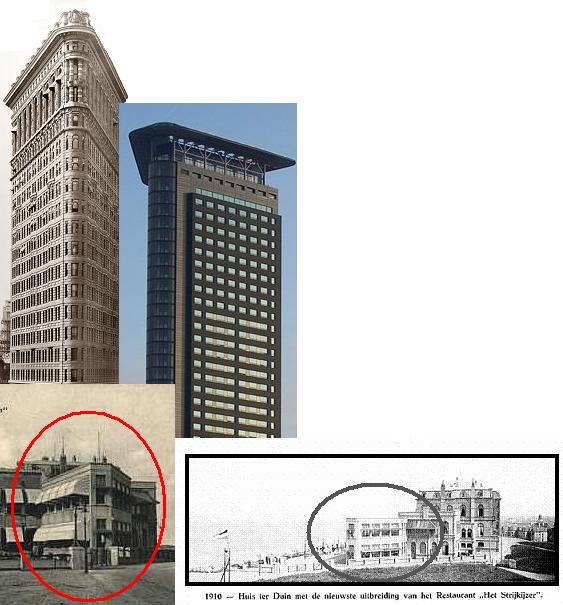 Grappig is dat al in 1910 een ‘strijkijzergebouw’ in Nederland werd neergezet: het nieuwe restaurant bij Huis ter Duin in Noordwijk. Die aangebouwde vleugel heeft van bovenaf zeker de contouren van een strijkijzer, maar de naam ‘knipoogt’ alleen maar naar zijn Newyorkse voorganger. Het Noordwijkse strijkijzer is zo plat als een dubbeltje en – letterlijk – nogal laag bij de grond. Maar toch.