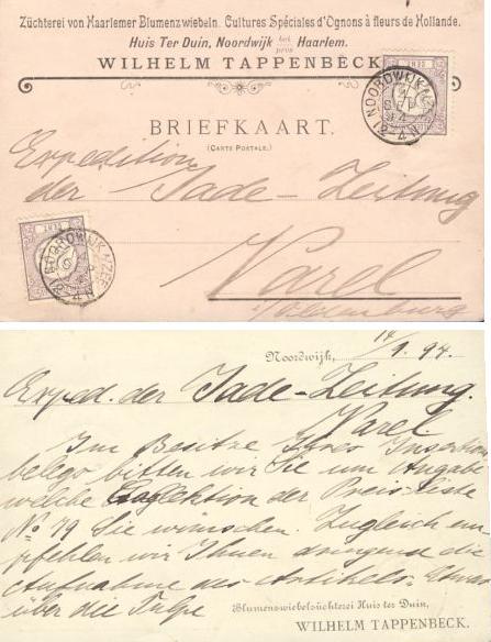 Van enige vorm van achterlijkheid viel hij niet te betichten, Wilhem Tappenbeck, uit Noordwijk (bei / près Haarlem). Met zijn “Züchterei von Haarlemer Blumenzwiebeln” en zijn “Cultures Spéciales d’Ognons (sic!) à fleurs de Hollande”.