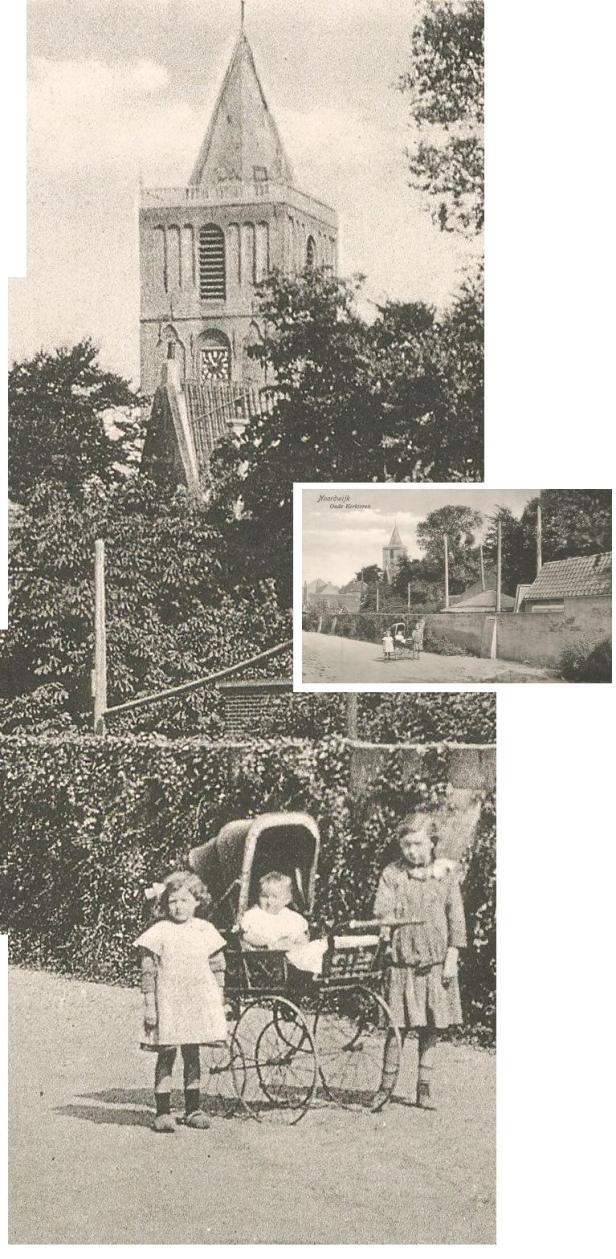 Het bijschrift bij deze prentbriefkaart uit 1916 luidt: “Noordwijk – Oude Kerktoren” en “Gezicht op de toren in de Zwanensteeg”. Beide toevoegingen doen geen recht aan die aardige kinderen die daar wat geïntimideerd in de camera lijken te kijken. Zelfs de baby in de kinderwagen zie je al iets denken.