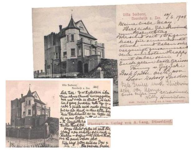 Het is wel een leuke gimmick natuurlijk: om je eigen postpapier of je eigen ansichtkaart te bedrukken met een foto van je eigen huis. Georg Poensgen deed het: zijn Villa Seehorst prijkte fier op het poststuk. Wie de afzenders zijn van de kaarten, weet ik niet. Duitse handschriften zijn sowieso moeilijk te lezen, maar deze beide kaarten helemaal.