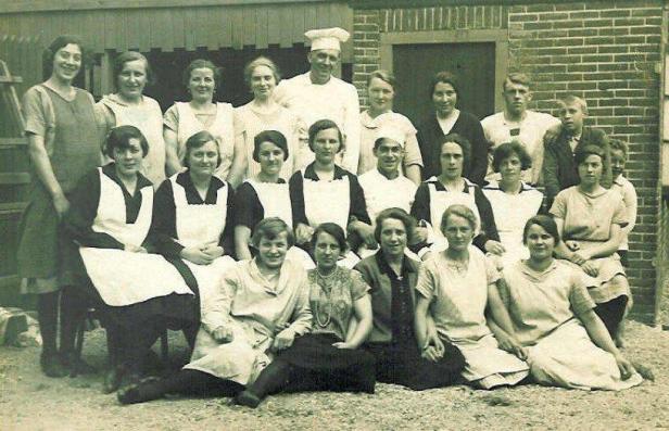 De voltallige (?) staf van hotel-pension Noordzee aan de boulevard in Noordwijk midden jaren vijftig. Tweeëntwintig man en vrouw sterk (en dan tel ik dat jochie helemaal rechts nog maar niet mee, die zou zijn arbeidzaam leven pas later opnemen in een heuse – en nog altijd bestaande – strandtent).