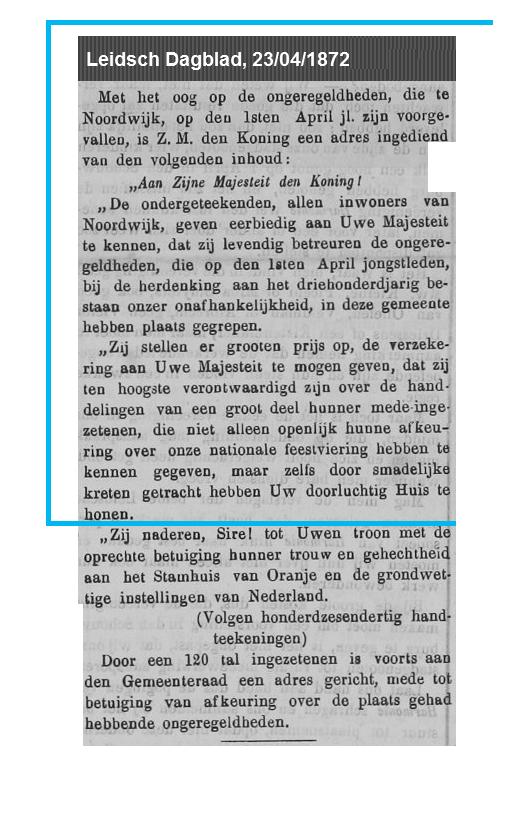 Het is van een onderdanigheid en kruiperigheid waar je geen weet van wil hebben. Blijkbaar vonden 136 inwoners van Noordwijk dat een onbekend aantal hunner medeburgers zich ernstig misdragen had door ‘met smadelijke kreten’ het Huis van Oranje te honen. En dat alles ook nog eens bij gelegenheid van de viering van 300 jaar ‘onafhankelijkheid’ op 1 april 1872. Blijkbaar werd de inval van de Watergeuzen in Den Briel hier gemarkeerd als het begin van de Nederlandse onafhankelijkheid, want dat was de enige gebeurtenis die op 1 april 1572 plaatsvond (Alva verloor zijn bril).
