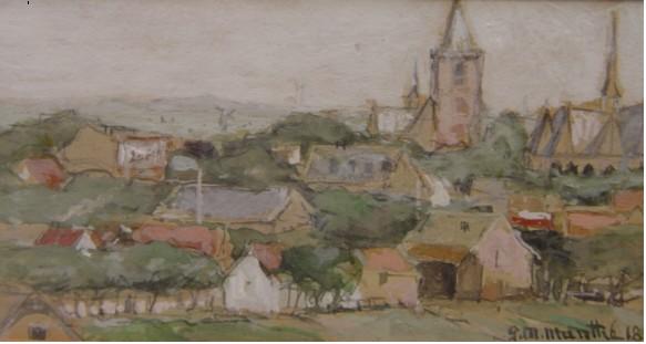 Het aquarel is van Gerhard Arij Luwig Morgenstjerne Munthe (1875-1927) en het is gesigneerd 1918. Het is getiteld “Zicht op Noordwijk-Binnen” en dat komt wel overeen met de “Stand der Dinge” rond de nieuwe katholieke kerk die toen nog steeds in aanbouw was. Rechts op de afbeelding zijn dan ook alleen nog maar het koor en het transept van dat nieuwe heiligdom te ontwaren, de rest kwam pas in 1924 gereed.