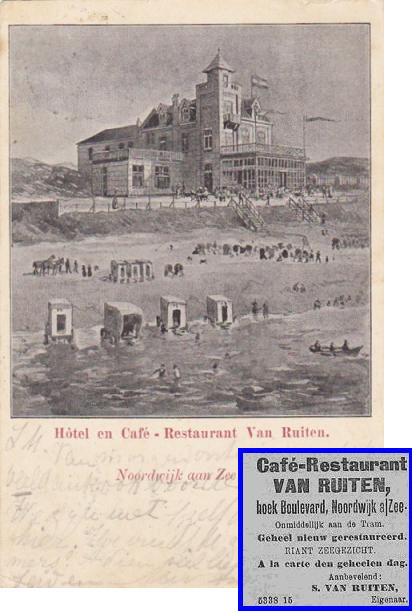 Café, annex Koffijhuis Rietmeyer was nog in 1898 uitgebreid met een heuse veranda, maar in 1904 worden de hele bliksemse boel openbaar verkocht. Ene S. van Ruiten maakt er prompt een modern hotel, café en restaurant van. “Hotel van Ruiten” is een feit. Er wordt een mooie kaart uitgegeven, die suggereert dat er in de verre omgeving van het nieuwe hotel geen ander gebouw de omgeving verpest en dat je als hotelgast strand en duin zo ongeveer helemaal voor jezelf alleen hebt. S. van Ruiten wist er wel raad mee: ook advertenties in het Leidsch Dagblad moesten klandizie lokken: “à la carte den geheelen dag”.