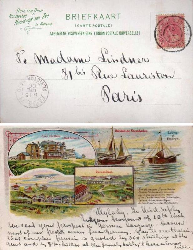 Het gevolg was dan ook bijgaand, in krom Engels gesteld kaartje aan ene ‘mylady’. Ze kreeg een prospectus in het Duits (omdat er geen Engelse voorradig was). Ze kreeg ook nog voorgerekend wat de tarieven in shillings waren. En ze werd in de adressering aangesproken met ‘madame’, maar in het briefgedeelte met ‘mylady’. Ik weet niet of ze ooit daadwerkelijk naar Noorwijk gekomen is.