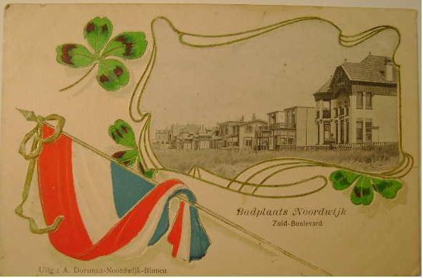 Het lijkt erop dat de kaart uit 1904 bij een bijzondere gelegenheid is uitgegeven. Nederlandse vlag, klavertjes vier, foto: een hoop huisvlijt op een paar vierkante centimeter. Maar er wordt niets bij vermeld, behalve dan dat het een carte postale is en dat die uitgegeven is door Dorsman in Noordwijk.
