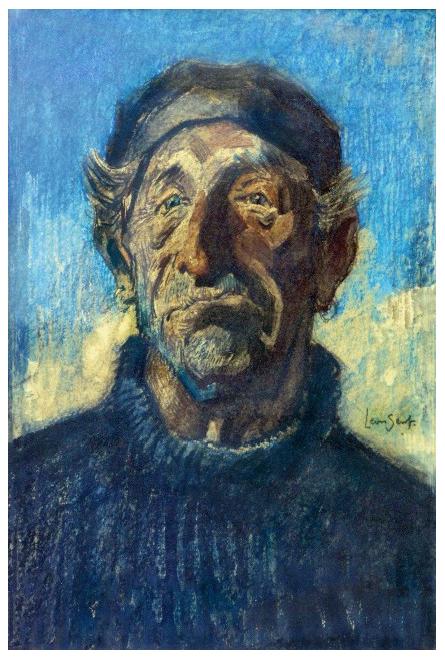 Senf (1860 – 1940) was vooral plateelschilder en ontwerper, werkzaam bij De Porceleyne Fles in Delft, zenuwcentrum van alle Delfts Blauw in de wereld. In zijn vrije tijd schilderde en etste hij. Bijgaand schilderij van een Noordwijkse Vissersman suggereert dat Leon Senf ook in zijn vrije tijd alles nog door een blauwe waas zag, maar dat was niet zo.