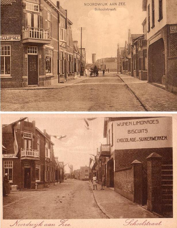 Op de bovenste foto lijkt het alsof de watertoren op de achtergrond nog in aanbouw is. Dat zou erop duiden dat het rond 1917 is en dat de bovenste kaart dus ouder is dan de onderste. Daar staat weer tegenover dat op de bovenste foto de nieuwe technologie al is doorgedrongen tot de Schoolstraat in de vorm van een heuse telefoon- of telegraafpaal, links op de stoep.