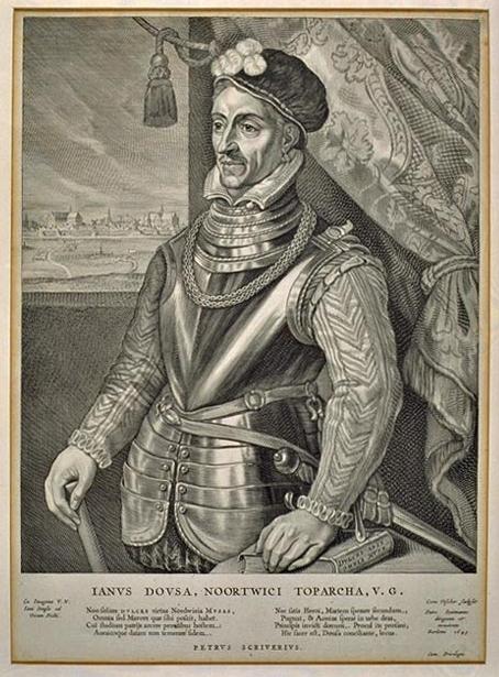 Dit is een portret van die ‘andere’ Noordwijkse Janus: Janus Dousa. Niet een man met twee gezichten, maar met zes verschillende petten: Heer van Noordwijk, dichter, filoloog, historicus, bibliothecaris van de Leidse Universiteit en veldheer die Leiden ontrukte aan de macht van de Spanjool. Niet mis, deze Janus. Overigens heette Janus Dousa gewoon ‘Jan van der Does’, dat gekoketteer met het Latijn was die verwaande Leienaren aan de Alma Mater (sic!) nu eenmaal met de paplepel ingegoten, dat konden ze ook niet helpen (ik ben er zelve ook een).
