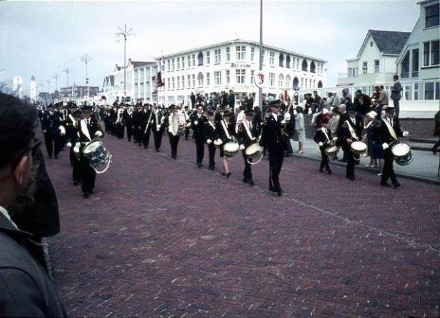 Daar komt nog bij dat de drie Noordwijkse ‘fanfare’s maar moeilijk van elkaar te onderscheiden waren met hun nogal gedekte, donkerblauwe uniformen. Zie bijgaande foto van een marcherende fanfare of harmonie of brassband op de boulevard van Noordwijk. En vertel me welke gezelschap hier zo fier aan de camera voorbijtrekt.