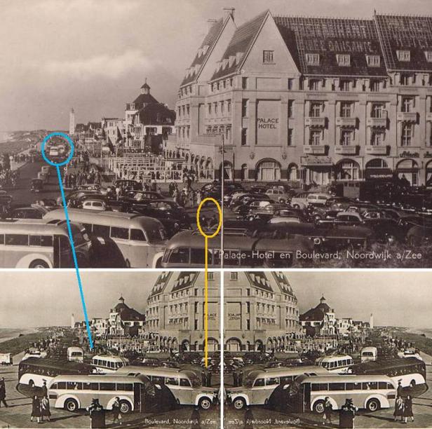 Als je goed kijkt zie je dat de bovenste foto iets later genomen is dan de onderste. De twee bussen in het blauwe rondje zijn dan al weer wat verder dan ze waren op de onderste foto. En dat het wel degelijk om ongeveer hetzelfde tijdstip ging bewijzen wel de twee bussen links vooraan op de bovenste foto en de schaduw – in het rode rondje – die ze werpen. Alles komt ook op de onderste foto terug, evenals de twee personen in het gele rondje.
