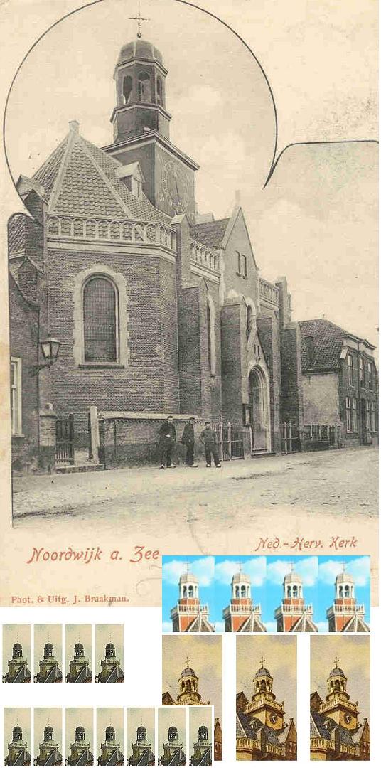 Aardig is te zien hoe zeer het torentje in de loop der tijden veranderd is. Althans vanaf het einde van de 19e eeuw: aanvankelijk nog een toren zonder trans, althans een trans met hekwerk eromheen. En daarna geschilderd in verschillende kleuren, eerst geel dan rood. De vraag is natuurlijk wat de oorspronkelijke kleur was. Maar een kleurenfoto uit 1647 heb ik niet zo snel paraat en van een geschilderd beeld uit die tijd heb ik geen weet.