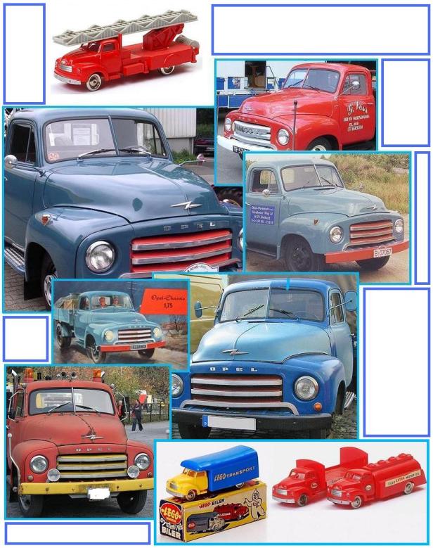 Ikzelf had ook enkele ‘Opel Blitzen’ in mijn Lego-pakket. Ik heb de plaatjes van een verhuiswagen, een tankwagen en een brandweerwagen ff teruggehaald via internet. Daar staan deze modellen geboekstaafd als ‘Bedfords’. Maar Bedfords waren de Engelse Opel-vrachtwagens, zoals Vauxhall de Engelse Opel-personenwagens waren. Ik noemde mijn Lego-auto’s in ieder geval ‘Opels’.