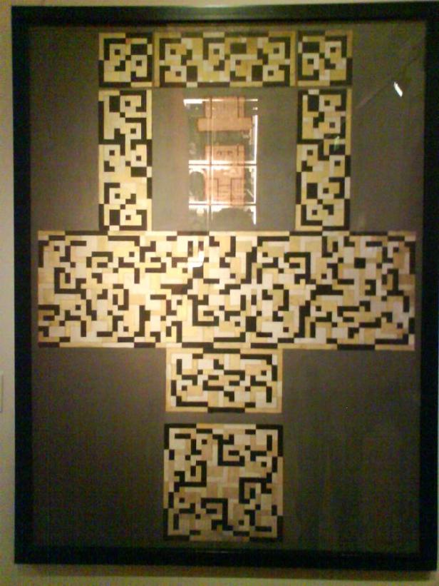 Het is allemaal veel te veel en veel te mooi wat ik op de tentoonstelling zie. Ik grijp me maar vast aan een anker dat ik ook nog even fotografisch vastleg met mijn telefoon (of telefonisch vastleg met mijn fotoapparaat): Ontwerp voor een Tegelvloer in Vakantiehuis De Vonk bij Noordwijk (1917-1918). Even verderop wordt een videootje gedraaid van De Vonk én van de tegelvloer én van de tableaus aan de buitenkant van het gebouw (dat voor de preciezen onder ons in Noordwijkerhout staat en voor de rekkelijken – zoals ik – in Noordwijk).