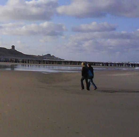 We lopen verder over het strand naar Domburg. In de aanloop over het strand zien we het dorp al snel liggen achter hoge palen die als golfbreker dienst doen. Domburg is erg Noordwijks: veel terrassen op een relatief klein aantal vierkante meters, de sfeer van een badplaats aan zee. Ik zoek naar verdere verbinding, maar ik kom niet verder dan Jan Toorop die hier een tijdje woonde en werkte. Later ging hij naar Katwijk en van daaruit ging hij vaak naar Noordwijk (op bezoek bij Verwey of bij mevrouw Van der Schalk en haar dochter op het Lindenplein in Noordwijk-Binnen).