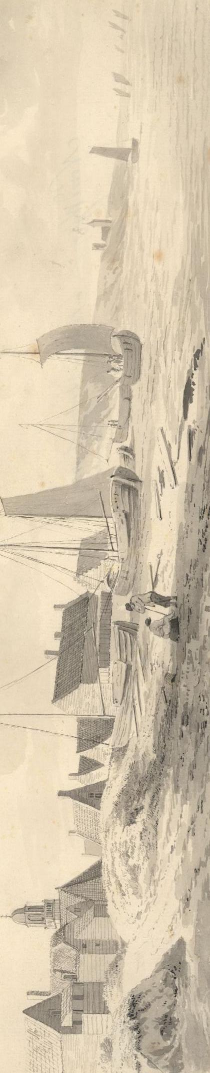 Huizen dicht op het strand gebouwd, bomschuiten bijna in de achtertuin. De kerk ter rechterzijde van het dorp staat er perspectivistisch een beetje vreemd bij: op die afstand en op die plek heeft volgens mij nooit een kerk gestaan. En als er aan die kant al een kerk stond, stond die veel verder, in Katwijk, aan de andere kant van de uitwaterende Rijn. En die is op deze tekening ook niet te bekennen.