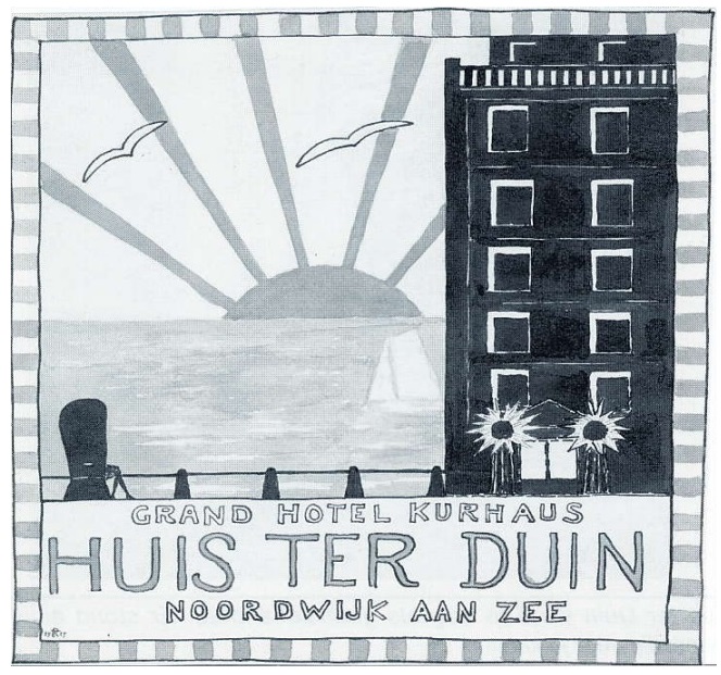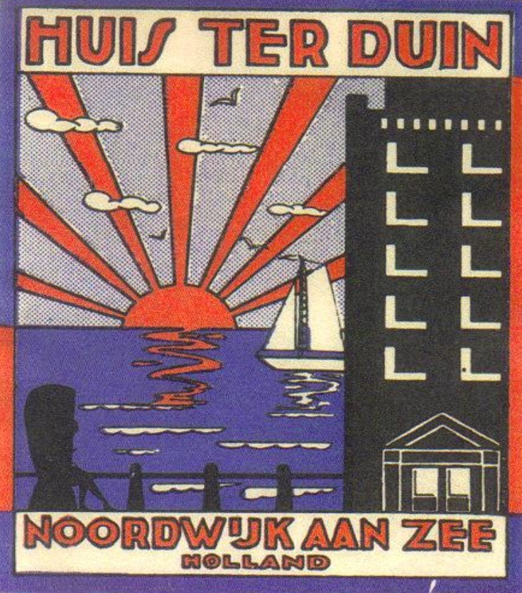 Ik heb dit bagagelabel er wel eens eerder uitgevist, maar soms is het een schande om niet in herhalingen te vervallen. Het label is eigenhandig door Rudolf Tappenbeck ontworpen was. Tappenbeck – telg uit het vermaarde geslacht dat Huis ter Duin groot heeft gemaakt – was een uiterst creatieve man, die zich naast de hotellerie ook bezighield met radiozendamateurisme én ook in die tak van sport grafisch bezig was. In een eerder blog schreef ik dat dit label in al zijn eenvoud een onverkwikkelijke schoonheid bezit. Ook dát herhaal ik nog maar eens. Het zou nog wel eens aardig zijn om een tentoonstelling te bouwen rond alle grafiek waarmee de Noordwijkse horekafferij en de Noordwijkse VVV hun doelgroepen benaderden. Daar zat nog veel meer moois tusschen. Ook dat andere moois is elders in dit blog regelmatig getoond.
