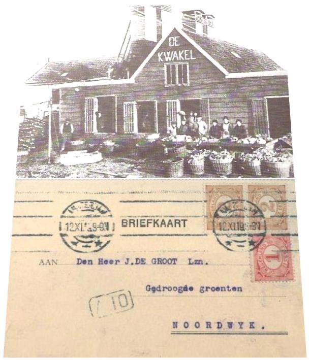 De groentendrogerij kreeg in 1919 een briefkaartje uit Amsterdam, we weten niet wat er op de achterkant stond (koop het ding op E-Bay, dan weet je het). De groentendrogerij – uit armoede geboren – bleef toch nog voortbestaan tot de Tweede Wereldoorlog, maar daarna trok de handel in bloembollen blijkbaar weer aan.