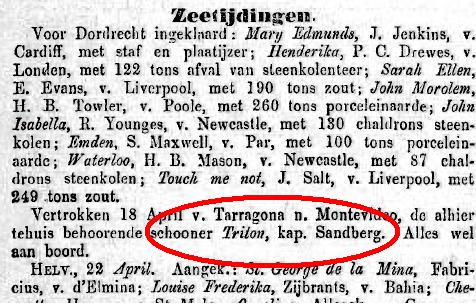 PS Dat het schoenerschip "Triton"" en schipper E.R. Sandberg bij elkaar hoorden, zoals in de akte wordt beweerd, klopt. In de Dordrechtse Courant van 24 april 1862 wordt e.e.a. bevestigd in een scheepvaartbericht, waarin gemeld wordt "Alles wel aan boord."