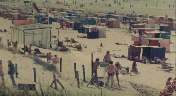 Het is het Noorderstrand bij Noordwijk, begin jaren zestig. Wat van alles het meeste opvalt is de oorverdovende afwezigheid van schreeuwerige reclames. Een Nederlandse en een Duitse vlag, dan heb je het wel gehad.