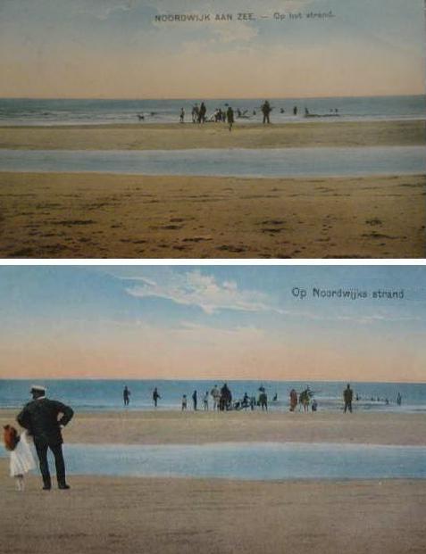 Het is niet eens zeker dat het hier om Noordwijk gaat (en als het om Noordwijk gaat is er niks specifiek Noordwijks aan). ‘Noordwijk aan zee – op het strand’ en ‘Op Noordwijks strand’ zijn niet echt met de kaart meegedrukt, maar er waarschijnlijk los op gestempeld. Op die manier kon je dezelfde kaart ook elders verkopen: in Katwijk stond er Katwijk op, in Zandvoort stond er Zandvoort op en in Domburg Domburg. Al naar gelang de plaats van verkoop werd een bijpassend stempel opgezet.