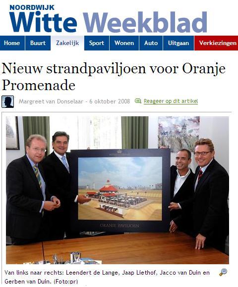 Na “De Zeemeeuw” is nu een tweede permanent strandpaviljoen in aanbouw op het Noordwijkse strand. Ik begrijp er nog steeds geen sikkepit van: hebben ze uit angst voor de hoge waterstanden net de hele bliksemse kustlijn bij Noordwijk opgehoogd, gaan ze weer in ‘de uiterwaarden’ bouwen. Maar goed: ‘Palm Plaza’, moet het nieuwe paviljoen gaan heten en het komt vóór de Hotels van Oranje op het strand te staan. Ik schreef er al eerder over: die aardige gimmick met dat torentje van de oude kapel aan de Hoofdstraat. Het werd in 2008 allemaal al aangekondigd, maar pas afgelopen vrijdag ging de eerste paal de grond in. Een Noordwijkse architect (Jacco van Duin) tekende voor het erg Noordwijkse ontwerp.