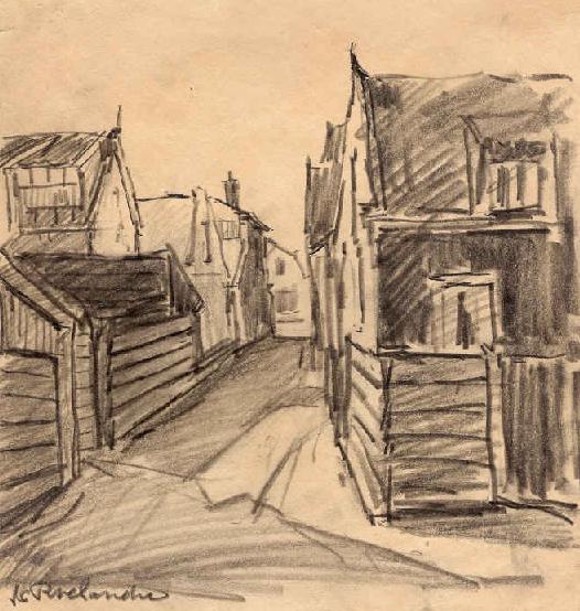 Bij de vorige tekening van Roelandse (‘Straatje in Noordwijk aan Zee’) zijn twee Noordwijkers volledig de weg kwijt geraakt. Ze konden niet traceren waar of dan wel dat straatje geweest moet zijn (of misschien nog steeds is). Ze kwamen er niet uit. Eén suggestie (Nic. Barnhoornweg) was misschien zo gek nog niet, wetende dat Roelandse vooral inspiratie haalde uit het oude gedeelte tussen Hoofdstraat en Schoolstraat,