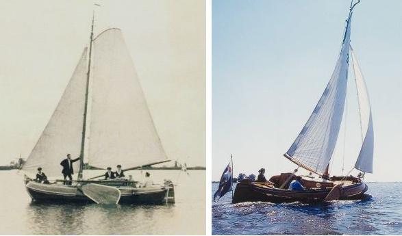 De Dolfijn (links), later De Hekse (rechts) was zo’n boeier. Volgens ingewijden de op één na oudste platbodem van Nederland. gebouwd in 1872 in Kampen. Naar verluidt was het een beurtschipper die de Dolfijn schonk aan zijn beide zonen, die er korte vrachttrips mee uitvoerden. Het schip heette toen nog “De Twee Gebroeders”.