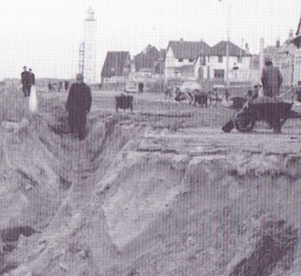 Nu word ik geattendeerd op een foto van de stormvloedramp van februari 1953. Een kaal- en half weggeslagen boulevard van Noordwijk met op de achtergrond de Vuurtoren. En daar, tegen die vuurtoren aan, staat een stellage, een steiger, die erop duidt dat mensen daar aan het werk waren. En de stellage reikt tot aan het punt waarop ‘het erkertje’ zich vanuit de toren zou uitstulpselen (als dat een Nederlands woord is). Het erkertje dateert van 1953.