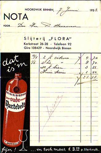Ik heb al eerder ‘geciteerd’ van de flickr-site van Gerard Steenvoorden, die een keur van prachtige foto’s en documenten uit de jaren vijftig en zestig van de vorige eeuw voor de digitale eeuwigheid bewaard heeft. Ik kan niet nalaten nóg een keer te citeren en doe dat met een rekening uit 1938 van Slijterij Flora uit de Kerkstraat. Een liter zeer oude genever kostte ‘toch maar’ 3 gulden en 25 cents. Je kocht nog gewoon op de pof: op 7 juni pas betaalde je de drank die je op 15 mei en op 1 juni al gehaald had. En Van der Voort – ik neem aan dat hij toen nog degene was die de tent uitbaatte – schreef er dan voldaan ‘betaald’ op.