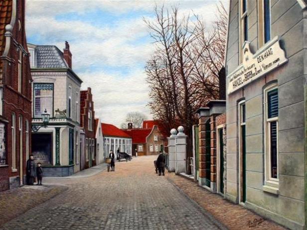 Ik heb de link naar de galerie die schilderijen als deze verkoopt al een paar jaar in de rechterkolom staan. Toen ik hem onlangs weer eens aanklikte zag ik tot mijn verrassing dat er weer nieuwe, prachtige werken waren bijgekomen. Rob van Assen is de schilder en hij tovert oude ansichtkaarten om tot een nieuwe (of oude) werkelijkheid.