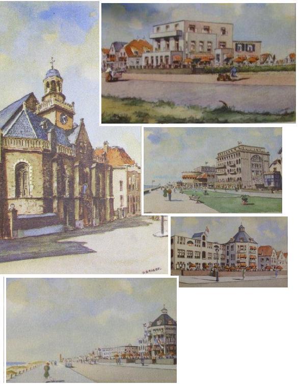 We waren gebleven bij 3 ‘Noordwijkse’ kaarten van Bob Brobbel: van het Palace Hotel, het Rembrandt Hotel en Hotel Hollander. Inmiddels krijg ik van R. (met veel dank) nog 5 (vijf!) andere kaarten toegezonden, ook allemaal van de hand van dezelfde kunstenaar: de oude kapel aan de kop van de Hoofdstraat, Hotel Noordzee, Huis ter Duin, Hotel-Pension Clarenwijk en een bredere blik op de Noordboulevard.