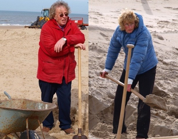 Klaas lijkt wel een ambtenaar (leunend over zijn schop) Terwijl Els maar hard aan het werk is.