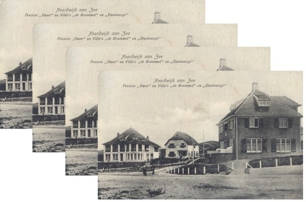 De rechter villa werd ‘Duinroosje’ genoemd. Weder de Wikipedia: De duinroos bloeit in mei en juni met crèmekleurige, soms roze aangelopen, bloemen. De bloem is alleenstaand, 1,5-5,5 cm groot en heeft geen steelblaadjes. De vruchtbeginsels zijn ingesloten in een holle, flesvormige bloembodem. De korte, gaafrandige kelkblaadjes staan na de bloei rechtop en blijven nog lang vastzitten. De rozenbottels zijn donkerbruinachtig paarse of meer zwarte vlezige bloembodems met daarin de nootjesachtige vruchten. Ze zijn zeer rijk aan vitamine C en kunnen gebruikt worden voor onder meer marmelade, confiture, gelei, sap, siroop en gebakvulling. De naam ‘duinroos’ is hier op het duin niet misplaatst. Waarom de bouwer of de eigenaar hier het verkleinwoord ‘duinroosje’ heeft gebruikt, is niet duidelijk, maar wel misplaatst. Zo’n stoer en stevig huis, dat ga je niet kleiner maken.