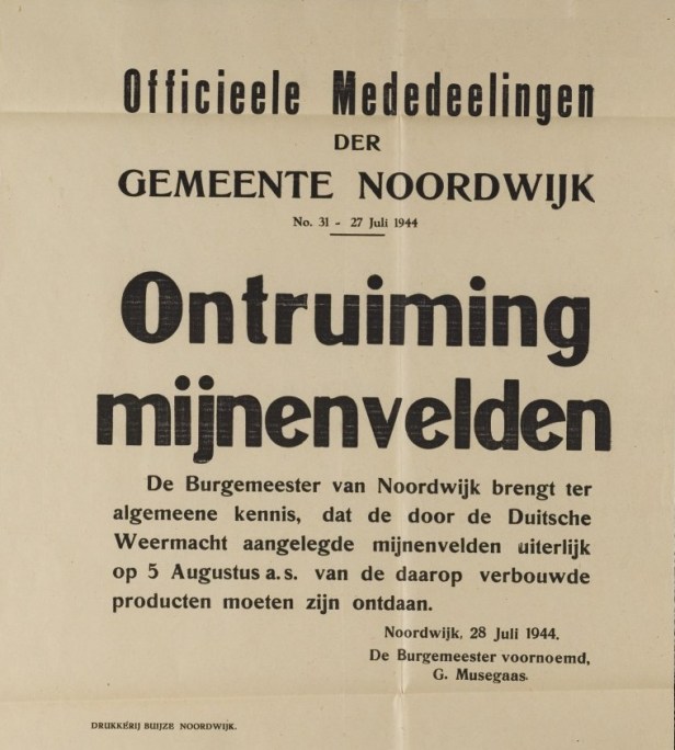 Ik weet niet of het aan mij ligt of aan NSB-burgemeester Musegaas of aan het gegeven dat in de zomer van 1944 iedereen zo ongeveer gek geworden was. Maar deze mededeling van de burgemeester is wel héél erg curieus: Noordwijkers wordt gevraagd de oogst binnen te halen uit de door de Duitsche Weermacht aangelegde mijnenvelden!!
