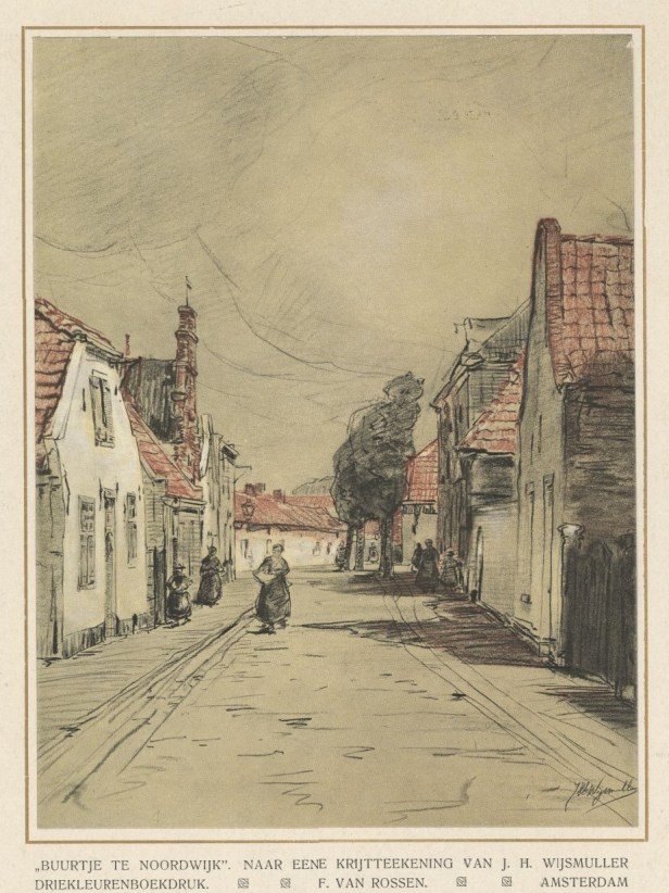 Nu kom ik waarachtig toch nóg een prachtige prent van hem tegen. In de schatkamers van het Regionaal Archief Leiden en Omstreken. Een krijttekening van ‘een buurtje’ in Noordwijk. Maar welk buurtje? In Noordwijk-Binnen, zo te zien aan de bomen (want in het oude dorp ‘Op Zee’ groeiden geen bomen. Op ansichtkaarten uit die tijd is er tenminste niet één te bekennen).